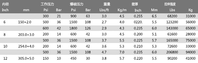 建议使用的最大工作压力:上述爆破压力值的50%(短暂使用)。为了保证软管的最长使用寿命,建议工作压力或拉伸力不要超过上述参数值的1/3。