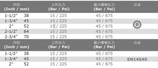 Higflex船用水带为EPDM衬里,成品轻薄,内壁光滑,保证水流顺畅。衬里结构紧凑,有较好的耐腐蚀性,抗氧化,暴晒,水解及霉变。